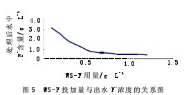 1)人工配制高氟水WS-F降氟劑和MR高分子絮凝劑降氟實(shí)驗(yàn)。WS-F投加量與出水F-濃度的關(guān)系見(jiàn)圖5所示。