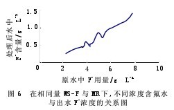 MR高分子絮凝劑作助凝劑,如單用MR高分子絮凝劑并沒(méi)有除氟效果,但其與WS-F聯(lián)合使用時(shí),可使WS-F產(chǎn)生的絮凝體顆粒明顯增大,澄清速度加快。通常需要4~6h才能絮狀物沉淀到底的WF-F投加MR高分子絮凝劑,其沉淀時(shí)間可減少到30min以?xún)?nèi),上清水清轍透明,過(guò)濾速度加快。收取上清水和濾后水進(jìn)行檢測(cè),對(duì)同一種含氟原水試驗(yàn)經(jīng)處理后水中氟含量都很接近。對(duì)不同濃度的天然含氟水,在投加相同量WS-F和MR情況下的降氟效果見(jiàn)圖6所示。