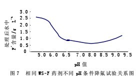 pH值對(duì)絮凝沉淀的效果有直接影響。把同一種水樣調(diào)成不同pH值,投加WS-F0.65g/L,MR 1mg/L,其除氟效果見(jiàn)圖7所示。