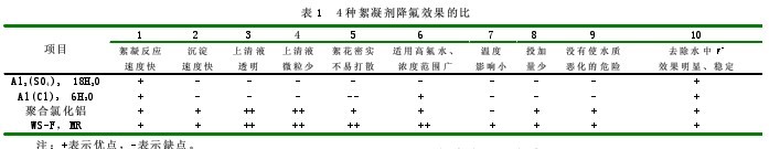 4種絮凝劑降氟改水的優(yōu)缺點(diǎn)如表1所示。結(jié)果表明,聚合氯化鋁的處理效果尚可,尤其新型絮凝劑WS-F,MR絮凝劑在絮花密實(shí)、沉淀時(shí)間、投加量和受溫度影響小等方面具有明顯的優(yōu)勢(shì)。