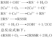 Merox 固定床吸附脫硫醇工藝是國際上近期發(fā)展最快的方法之一,固定床吸附工藝具有流程簡單、投資少、操作簡便等特點,其載體一般是活性炭,催化劑是磺化酞菁鈷或聚酞菁鈷。固定床工藝流程將含有硫醇的L PG 與分散在多孔載體上的金屬酞菁鈷催化劑接觸,在堿性條件下,用空氣將硫醇氧化成二硫化物。其原理如下: