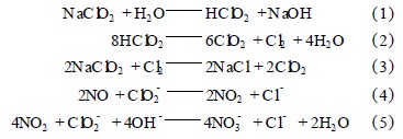 NaClO2 為白色晶體或結晶狀粉末,具有很強的氧化性。在國外,NaClO2 常常被用來與酸或堿共同去除NOx ,通常的做法是在凈化系統(tǒng)中加入堿性吸收液以去除NO和NO2。