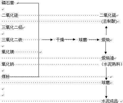 在爐料中若加入氧化鐵、氧化鋁、高嶺土等助溶劑,更有利于硫酸鈣分解溫度得降低。在此,如若摻進(jìn)爐料中的氧化鐵、氧化鋁、高嶺土等配比得當(dāng),那么煅燒后所得爐渣就是水泥熟料,磨碎之后即得水泥;而反應(yīng)生成的二氧化硫送往硫酸車間制成硫酸,得到的硫酸又送到磷銨車間。這樣,磷銨廠就再也不會有廢渣了,也不用到外地購買大批硫鐵礦來生產(chǎn)硫酸。其工藝過程如圖2。