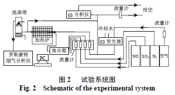 試驗(yàn)系統(tǒng)如圖 2 所示,壓縮空氣經(jīng)臭氧發(fā)生器放電產(chǎn)生臭氧,部分O3 經(jīng)流量計(jì)后送入反應(yīng)器氣體入口1,臭氧濃度采用IN2000 型臭氧分析儀在線測量,臭氧分析儀旁路流量計(jì)起調(diào)壓作用。NO、 SO2、N2 等氣體經(jīng)流量計(jì)后進(jìn)入混合箱,然后送入反應(yīng)器氣體入口2,試驗(yàn)中維持總氣體流量在 1L/min 左右。尾部氣體成分由羅斯蒙特?zé)煔夥治鰞x NGA2000 在線測量(紅外、紫外原理),測量結(jié)果以 5s/次的采樣頻率記錄在電腦當(dāng)中,由于NGA2000型煙氣分析儀的NO2和SO2模塊采用紫外吸收的原理,O3 會(huì)產(chǎn)生較大的測量干擾,對(duì)SO2 的氧化試驗(yàn)采用HORIBA 的PG250 型紅外煙氣測量儀器進(jìn)行。