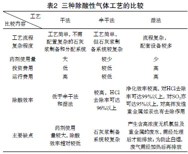 酸性氣體凈化工藝可分為干法、半干法和濕法三種,每種工藝在工程上都有廣泛應(yīng)用,也各有優(yōu)缺點(diǎn)。三種方法的比較結(jié)果見表2。