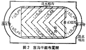 雨水的滲透過程:面層→場地下部排水墊層→盲溝→排水暗溝→排水管。體育場盲溝布置如圖2所示。