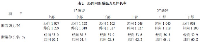 上鋼五廠100 t 直流煉鋼電爐采用長(zhǎng)袋低壓脈沖袋式除塵器,過濾面積11 716 m2 ,設(shè)計(jì)處理風(fēng)量80 萬m3/ h ,設(shè)計(jì)過濾風(fēng)速1. 14 m/ min ,設(shè)計(jì)清灰后濾袋壓力損失600~700 Pa , 濾袋設(shè)計(jì)壽命3 年。在濾袋使用2 年零9 個(gè)月的時(shí)候,該廠分別在除塵器尾部?jī)上潴w中各取1 條濾袋進(jìn)行檢驗(yàn)。檢驗(yàn)結(jié)果如下: