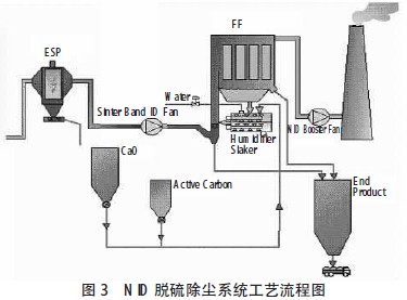 NID脫硫除塵一體化技術(shù)是Alstom公司在20世紀(jì)90年代初從噴霧干燥法開發(fā)而成。該系統(tǒng)是利用含有CaO或消石灰的吸收劑與二氧化硫反應(yīng)生成CaSO3和CaSO4,除塵器收集下來有一定堿性的粉塵與CaO混合增濕后再進(jìn)入除塵器入口煙道和煙箱,反復(fù)循環(huán)。NID脫硫除塵系統(tǒng)包括反應(yīng)器、高濃度除塵器(ESP或FF)、混合器、循環(huán)灰輸送系統(tǒng)四個核心系統(tǒng)。中國武漢鋼鐵公司正在進(jìn)行NID脫硫除塵工藝的設(shè)計建設(shè)。NID脫硫除塵系統(tǒng)工藝流程見圖3。