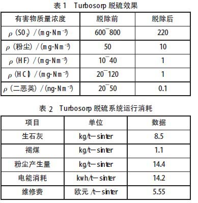 該脫硫技術(shù)和除塵工藝具有以下技術(shù)特點(diǎn):無污水外排;單塔處理能力大;無須防腐措施;脫硫裝置對負(fù)荷變化的適應(yīng)性強(qiáng)。1999年,奧地利AEE公司為德國某廠設(shè)計建造了燒結(jié)廢氣回收處理凈化裝置,主要由噴淋吸收塔、活性褐煤噴射器和石灰乳噴射器以及布袋除塵過濾器組成,生石灰經(jīng)加水形成石灰乳后通過高達(dá)13000r/min的旋轉(zhuǎn)噴射器在吸收塔下部逆向氣流噴射而出,石灰乳與煙氣中的硫化物混合發(fā)生化學(xué)反應(yīng),形成石膏,完成脫硫過程,脫硫后的煙氣通過管道進(jìn)入布袋除塵器,管道上還安裝活性褐煤噴射器,將褐煤噴入管道與煙氣進(jìn)行混合以脫除二惡英,煙氣進(jìn)入布袋除塵器后,完成氣與塵的分離,塵循環(huán)使用一定次數(shù)后外排,用于填埋廢舊礦山。Turbosorp脫硫效果及運(yùn)行消耗見表1,表2。
