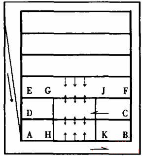 填埋分區(qū)內(nèi)可以再劃分若干填埋單元,填埋單元的庫(kù)容可填埋1—2d的垃圾,單元之間也可以路堤間隔,修建方式和分區(qū)路堤一樣,但可以不考慮車輛行駛。如圖1中G—H、J—K所示。