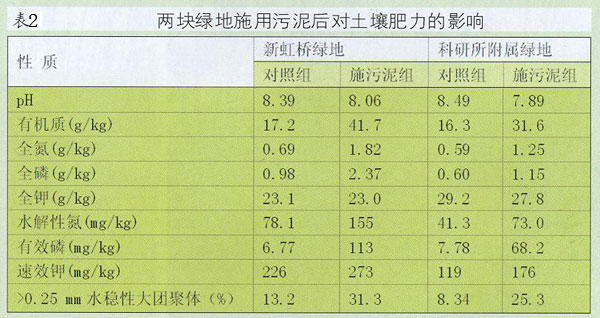 表2是新虹橋綠地和上海園林科研所附屬綠地,連續(xù)施用污泥3年后土壤肥力的變化情況。從中可以發(fā)現(xiàn),土壤pH有明顯的下降,施用污泥后土壤的有機(jī)質(zhì)含量遠(yuǎn)遠(yuǎn)超過了園藝發(fā)達(dá)國家對(duì)有機(jī)質(zhì)含量的要求(20 g/kg),而且除全K外(從上述的土壤調(diào)查可知上海綠地土壤不缺K),全N、全P、水解性N、有效P和速效K的含量均有明顯的增加。連續(xù)施用污泥3年后,這些養(yǎng)分的含量均約增加了2倍,尤以有效P的含量增加更為明顯;而且從>0.25 mm水穩(wěn)性大團(tuán)聚體所占比例也可得知,施污泥后土壤的理化性質(zhì)也得到了明顯的改善。這也可以從虹橋綠地施污泥后龍爪槐的長勢(shì)得到進(jìn)一步的證實(shí)。
