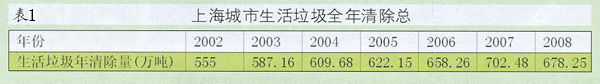 表1所示為2002-2008年上海城市生活垃圾的全年清除總量,從中可以計(jì)算得出,2002-2008年間上海城市生活垃圾全年清除總量的年平均增幅為2.9%。