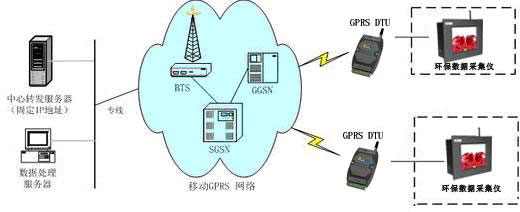 各監(jiān)控點使用GPRS透明數(shù)據(jù)傳輸終端,通過移動GPRS網(wǎng)絡(luò)與監(jiān)控中心相連。各污染源數(shù)據(jù)采集點使用移動通信公司統(tǒng)一的STK卡,同時監(jiān)控中心對各點進行登記,保存相關(guān)資料以便識別和維護處理。各信息采集點運行監(jiān)控系統(tǒng)軟件,支持24小時實時在線,實現(xiàn)信息采集點24小時傳送采集的環(huán)保信息數(shù)據(jù)。