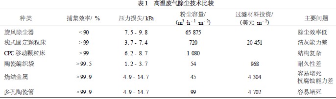 美國(guó)電力研究院(Electric Power Research Institute)曾綜合除塵效率、經(jīng)濟(jì)性等因素,對(duì)各種高溫氣體除塵技術(shù)作過(guò)總結(jié),結(jié)果如表1 所示。