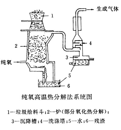 本法突出的優(yōu)點是只需(或不需)對垃圾進行簡單的破碎和分選加工,即簡化了預處理工序。主要問題是所需的氧氣能否廉價供給,否則將增大處理費用。利用上述原理的熱解系統(tǒng)也稱為Purox Process。