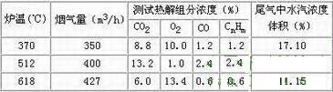 從上表可見,可燃成分熱解出現(xiàn)在370-618℃范圍,峰值512℃,與實際操作基本吻合。當(dāng)爐溫在370℃時,煙氣量小,尾氣中水汽濃度高,經(jīng)實際操作分析,一般一燃段溫度控制在500~600℃左右為佳,此時尾氣中水汽濃度小,灰渣的熱灼率適中。