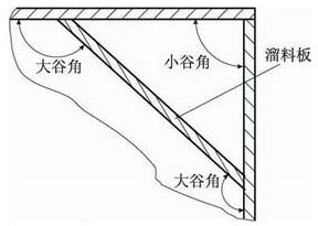 由表1可以看出,有導(dǎo)電纖維較無導(dǎo)電纖維針刺氈表面電阻、體電阻和摩擦電位都低得多。為防止煤粉自燃,結(jié)構(gòu)設(shè)計(jì)不能有積灰面。設(shè)備設(shè)計(jì)要符合防爆要求,本體上還必須裝有卸壓閥。煤磨袋除塵器的灰斗是很容易積灰的,煤粉塵細(xì)度細(xì),粒度小于40μm的占95%以上,附著性強(qiáng),粉塵還可能吸收空氣中的水分,在灰斗壁上冷凝。所以灰斗壁的傾角應(yīng)≥70°。在灰斗兩面形成的谷角處,設(shè)計(jì)一溜料板,成為兩個(gè)加大的谷角,減少粉塵的沉積,如圖1所示。