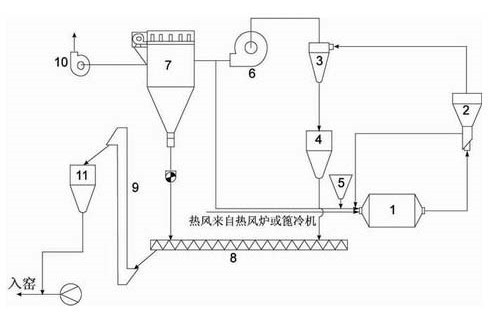 1.煤磨;2.粗粉分離器;3.細(xì)粉分離器;4.煤粉倉;5.原煤倉;6.煤磨風(fēng)機(jī);7.MDC袋除塵器;8.螺旋輸送機(jī);9.斗式提升機(jī);10.排風(fēng)機(jī);11.煤粉倉