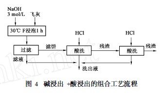 當(dāng)直接用酸浸提時(shí),為減少酸耗量,可在酸浸提之前進(jìn)行水洗預(yù)處理,并且水洗預(yù)處理可以增強(qiáng)飛灰中重金屬的熱穩(wěn)定性。飛灰中含有大量的Fe、Al、Ca、Mg、Si,這些為有毒重金屬含量的幾倍甚至幾十倍,在酸浸提時(shí),這些金屬也會(huì)被大量溶解,消耗大量的酸。另外,不同的酸對(duì)不同重金屬的浸出效率不同,因此可以采用幾種酸浸出與堿浸出有機(jī)結(jié)合的工藝(如圖4) ,能取得更好的效果。