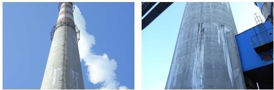 以水玻璃的作為粘合劑的耐酸膠泥有一個(gè)重要特性,是其耐強(qiáng)酸的特性遠(yuǎn)大于其耐弱酸的特性,在長(zhǎng)期煙氣的作用下(包括在露點(diǎn)下的酸液),可能膠泥層表面會(huì)逐漸受到侵蝕而影響粘接效果,而如果濕煙氣中含有氟化物,則對(duì)水玻璃材料的腐蝕將是致命的;另外由于材料的多孔性特點(diǎn),而這些孔也是非封閉性的,因此在煙氣作用下,會(huì)逐漸擴(kuò)散滲透到基礎(chǔ),使基礎(chǔ)受到腐蝕破壞。根據(jù)國(guó)家的設(shè)計(jì)標(biāo)準(zhǔn)的要求,水玻璃類耐酸膠泥是不適合用在脫硫煙囪存在的干濕(高,低溫)交替工況條件。