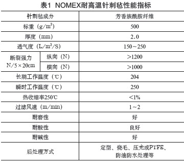 (1)濾袋的選擇:袋式除塵器是一種利用有機纖維或無機纖維過濾布將含塵氣體中的固體粉塵在濾袋的過濾、慣性碰撞、攔截、擴散、靜電、重力沉降等作用下分離出來的一種高效除塵設(shè)備,布袋的好壞直接關(guān)系到除塵系統(tǒng)的效率。精湛的縫制技術(shù)和選用合適優(yōu)質(zhì)的濾料,是保護該系統(tǒng)高效率的關(guān)鍵。國內(nèi)濾料的發(fā)展與袋式除塵器的發(fā)展是同步的,瀝青攪拌設(shè)備除塵用濾料主要是NOMEX針刺氈濾料、芳綸針刺氈濾料等。其中 NOMEX針刺氈濾料的性能指標見表1。