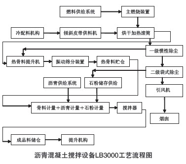 以一家瀝青混凝土攪拌設(shè)備LB3000袋式除塵器為例,其生產(chǎn)能力是每小時180~240噸,煙氣入口溫度小于200℃,成品料溫度140℃~180℃,因為燃料為重油,所以煙氣里含有一定的酸性氣體,而煙塵主要來自骨料烘干系統(tǒng)和重油燃燒的殘留物,粉塵顆粒細,并帶有粘性,而且骨料有時含水量比較大,烘干時會產(chǎn)生大量的水蒸汽。根據(jù)以上工況,除塵器濾料選用防油、防水NOMEX耐高溫針刺氈濾料。瀝青混凝土攪拌設(shè)備LB3000工藝流程如下圖,除塵器具體參數(shù)如表2。