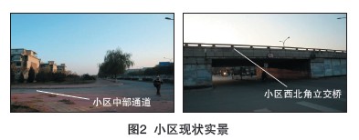 該小區(qū)位于西環(huán)北路東側(cè),西北側(cè)路口為一3m高的橋梁,西南側(cè)為路口。西環(huán)北路道路中心線距離小區(qū)的敏感建筑約48.5m,距離小區(qū)圍墻約42.5m。西環(huán)北路在小區(qū)中央位置處往北開始逐漸升高至橋梁高度(約3.5m高)。小區(qū)現(xiàn)狀平面布置圖和實(shí)景圖參見圖1、圖2。