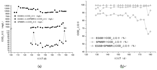 EGSB反應(yīng)器在啟動初期,進水CODcr濃度為1000mg/L左右,運行歷時180余天, EGSB+SPMBR工藝的聯(lián)合實驗是在第100天后進行的。EGSB和SPMBR工藝的進出水CODcr變化情況及去除率見圖2。