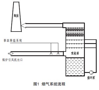 從鍋爐出來的煙氣經(jīng)電除塵器除塵,再經(jīng)引風(fēng)機(jī)升壓后直接進(jìn)入吸收塔內(nèi),原煙氣在吸收塔內(nèi)與噴淋層噴射的漿液逆向接觸,煙氣中的SO2等酸性污染物被洗滌吸收,經(jīng)除霧器除去液滴后的凈煙氣直接排至煙囪(見圖1)。