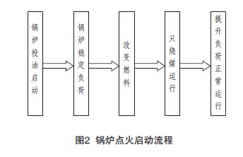 鍋爐的點(diǎn)火啟動(dòng)流程(見圖2)一般是,首先鍋爐投油啟動(dòng),待鍋爐穩(wěn)定負(fù)荷后,改變?nèi)剂,進(jìn)入煤、油混燃階段,之后逐步增大燃煤的加入量,同時(shí)減少投油量,待鍋爐穩(wěn)定后,進(jìn)入燃煤階段,并逐步提升機(jī)組負(fù)荷,進(jìn)入正常運(yùn)行階段。