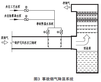在引風(fēng)機(jī)與吸收塔入口之間的煙道上設(shè)置兩級(jí)事故降溫水系統(tǒng),確保在FGD入口煙氣超溫、循環(huán)泵故障停運(yùn)時(shí)吸收塔塔內(nèi)件的安全。