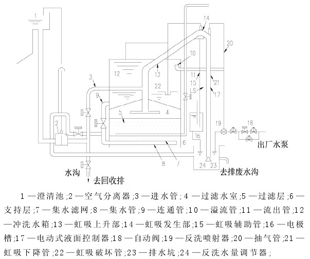 濾池剛投入運(yùn)行時(shí),虹吸上升管內(nèi)的水位和沖洗水箱的水位頭很小,約20m m 左右。隨著過濾的進(jìn)行,水頭損失增加,此進(jìn)進(jìn)水量不變,要保證一定出水量,虹吸上升管水位不斷提高。當(dāng)虹吸上升管內(nèi)水位逐漸上升到虹吸輔助上端處,水流向電極槽,電極槽水位到一定值時(shí),電極會(huì)發(fā)出信號(hào),反洗自動(dòng)進(jìn)行。