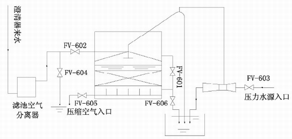 當(dāng)進(jìn)水濁度很小,或進(jìn)水量小于50%額定流量及自動(dòng)控制出現(xiàn)故障,在2天以上未進(jìn)行反洗,為確保濾池正常運(yùn)行,需進(jìn)行強(qiáng)制反洗耳恭聽。可用8kg/cm2、9m3/h的壓力水源啟動(dòng)強(qiáng)制反洗噴射器,抽出虹吸管內(nèi)空氣,即可形成虹吸,反洗開始。
