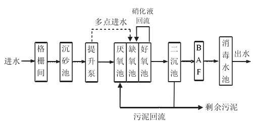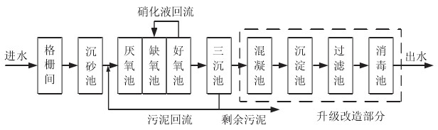 | 圖1 A2/O+混凝沉淀過濾工藝流程 |