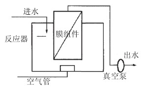 常見的一體式MBR的結(jié)構(gòu)如圖3。將膜組件直接置入生物反應(yīng)器內(nèi),曝氣器放在膜組件的下面,通過真空泵進行抽吸,得到過濾液。MBR作為污水經(jīng)二級處理后的深度處理工藝流程見圖4。