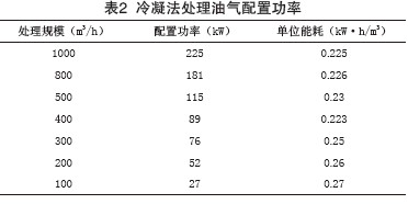 隨著制冷技術革命性的進步,壓縮機新型產(chǎn)品體積縮小、排量提高、能耗減少,新型制冷劑增加了單位質量制冷量,提高了制冷系統(tǒng)能效比,降低了冷凝法處理每立方米油氣的配置功率指標(見表2)。