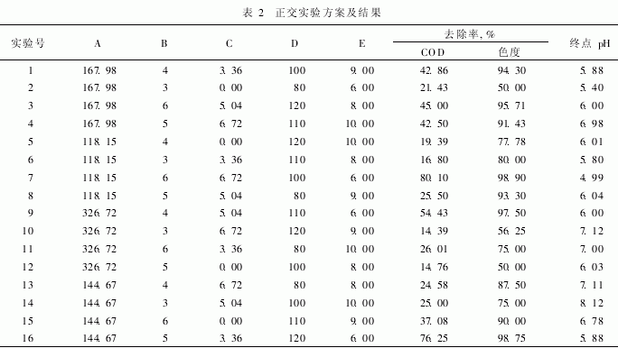 2.1廢水處理效果影響因素的確定用直接凍黃和表面活性劑配制不同初始COD的模擬制革廢水,根據(jù)資料和單因素實驗結(jié)果,選取初始COD(因素A)、光照時間(因素B)、催化助劑FeCl3加入量(因素C,以Fe3+的質(zhì)量濃度表示)、納米TiO2加入量(因素D,以TiO2的質(zhì)量濃度表示)以及初始pH(因素E)5個因素,每個因素選定4個水平,采用L16(45)正交實驗表進(jìn)行正交實驗,每組實驗重復(fù)一次,取COD去除率平均值和色度去除率平均值為評價指標(biāo),實驗方案和結(jié)果見表2。