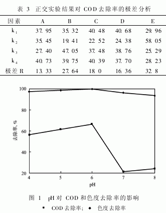 2.4其他因素對COD和色度去除率的影響從表2可看出,催化助劑FeCl3加入量、納米TiO2加入量及初始COD對廢水處理效果的影響相對不很明顯,所以這3個因素最佳水平的選取可以以經(jīng)濟(jì)、方便為原則。加入Fe3+主要是為了降低光催化氧化過程中空穴和電子的復(fù)合率,從而提高光催化效率。FeCl3加入量過多反而可能使FeCl3被吸附于TiO2表面,阻礙反應(yīng)進(jìn)行,所以FeCl3的最佳加入量定為最低水平3.36mg/L。納米TiO2加入量為100mg/L時COD去除率最高,而加入量為110mg/L時色度去除率最高,但納米TiO2加入量太少起不到催化效果,過多反而會對紫外光起屏蔽作用,從而降低光催化效率。因此,針對本實驗中的模擬廢水,納米TiO2最佳加入量定為100~120mg/L。初始COD的高低也會影響到納米TiO2光催化氧化效率,由實驗數(shù)據(jù)可知,廢水初始COD為144.67mg/L時的廢水處理效果最好。