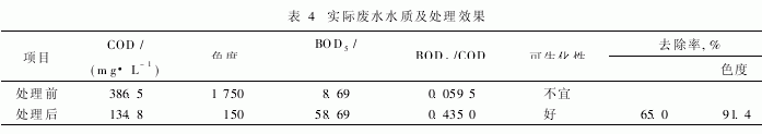 實際廢水取自寧波余姚某皮制件廠總排放口,廢水中主要污染物為直接凍黃染料和表面活性劑。采用本實驗的最佳工藝條件對此廢水進(jìn)行處理,結(jié)果見表4。