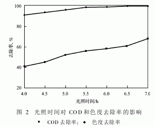 按照正交實驗中的最優(yōu)工藝條件,其他條件保持不變,分別在光照4.0,4.5,5.0,5.5,6.0,6.5,7.0h后取樣,測定廢水的COD和色度,結(jié)果見圖2。由圖2可知,光照時間直接影響廢水的COD和色度的去除率,且對COD去除率的影響更大。如果光照時間不足,廢水中有機(jī)物的光催化氧化反應(yīng)進(jìn)行不徹底,使處理后廢水的COD和色度達(dá)不到要求;相反,如果光照時間過長,雖然廢水的COD和色度去除率比較理想,但增加了廢水處理成本。因此,綜合考慮廢水處理效果和經(jīng)濟(jì)因素,確定最佳光照時間為6h左右。