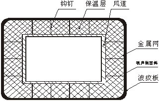 (3)施工工藝要求做到一層錯縫,兩層壓縫,無空隙,表面平整,每層吸聲材料要用壓板固定并用鐵絲網(wǎng)扎緊。