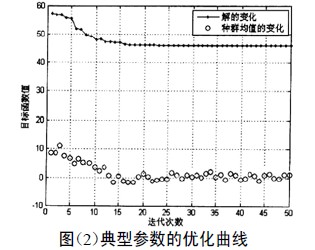 使用通用數(shù)學(xué)計(jì)算軟件matlab 與英國設(shè)菲爾德大學(xué)開發(fā)的遺傳工具箱進(jìn)行編程,實(shí)現(xiàn)多目標(biāo)遺傳算法優(yōu)化空壓機(jī)進(jìn)氣口消聲器。在程序中設(shè)置了多目標(biāo)遺傳算法的基本參數(shù)。各目標(biāo)函數(shù)有相應(yīng)的四端極子確定。下面以內(nèi)插式雙級擴(kuò)張消聲器子結(jié)構(gòu)為例,使用該程序?qū)ζ溥M(jìn)行結(jié)構(gòu)優(yōu)化。選取種群中個(gè)體數(shù)量: NIND=100;選取最大遺傳代數(shù): MAXGEN= 50;選取變異率: INP=0.05;采用實(shí)值編碼進(jìn)行優(yōu)化,其中典型參數(shù)的優(yōu)化曲線如圖(2)所示。