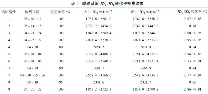 在不同工況和燃用不同煤種的情況下,檢測脫硝系統(tǒng)進、出口SO2 濃度,再以此計算出SO2 /SO3 轉化率, 1~8號爐脫硝系統(tǒng)檢測結果見表1。