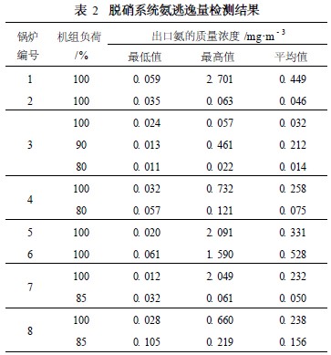 從表2可見, 1~8號爐SCR脫硝系統(tǒng)出口氨的質量濃度最高為2. 701mg/m3 ,最低0. 020mg/m3。在同1臺爐不同運行工況下, SCR系統(tǒng)出口氨濃度并不隨機組負荷的下降而降低。而在相同的運行工況下, 不同鍋爐脫硝系統(tǒng)出口氨濃度與機組負荷無關。所以,在脫硝效率滿足設計要求的情況下,只要控制系統(tǒng)噴氨量, SCR系統(tǒng)出口的氨逃逸量就可以控制在比較低的水平。