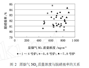 從圖2可以看出, 1~4號爐原煙氣NOx 質量濃度在492. 2mg/m3 ~793. 4mg/m3 之間, SCR系統(tǒng)脫硝效率為80. 6%~83. 6%。5、6號爐原煙氣NOx 質量濃度在546. 2mg/m3 ~822. 9mg/m3 之間, SCR系統(tǒng)脫硝效率為80. 0% ~84. 7%。7、8 號爐原煙氣 NOx 質量濃度在647. 9mg/m3 ~893. 5mg/m3 之間, 脫硝效率為81. 2%~84. 3%。