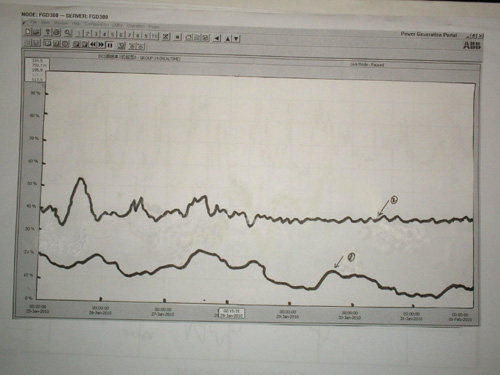 表3-1是某廠不同機組和除塵器效率情況和GGH沖洗頻次情況,圖3-2 是2010年1月某廠布袋除塵與電除塵出口煙塵濃度曲線DCS紀(jì)錄對比。從圖表中可看出,除塵效率越高,煙塵排放濃度越低,GGH的沖洗頻次大幅下降。1號機組改布袋除塵器后,GGH幾乎不發(fā)生堵塞,全年運行4300小時,GGH不用停機清洗。