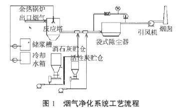 本系統(tǒng)包括反應(yīng)塔、布袋除塵器、工藝水系統(tǒng)、石灰漿存儲(chǔ)及制備系統(tǒng)、活性炭噴射系統(tǒng)、飛灰輸送及存儲(chǔ)系統(tǒng)。其工藝流程如圖1 所示。