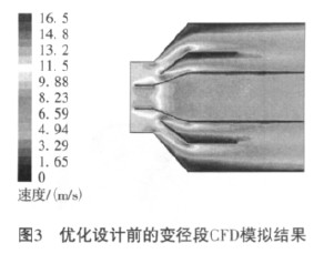 為了保證反應(yīng)塔3 個(gè)進(jìn)口煙氣流量、流速分布均勻,需要對(duì)反應(yīng)塔進(jìn)口前的變徑段做CFD 模擬和優(yōu)化設(shè)計(jì)。首先對(duì)圖2 的設(shè)計(jì)進(jìn)行CFD 模擬,結(jié)果見圖3。
