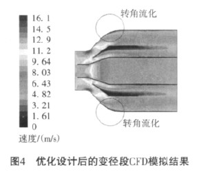 由圖3 可知,導(dǎo)流板轉(zhuǎn)角處有渦流,需對(duì)轉(zhuǎn)角進(jìn)行設(shè)計(jì)優(yōu)化。在對(duì)轉(zhuǎn)角進(jìn)行流線處理后,再次進(jìn)行CFD 模擬,結(jié)果見圖4。