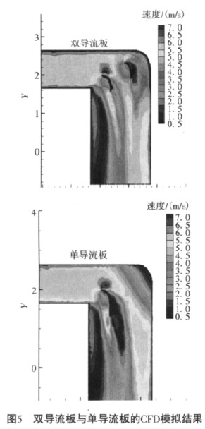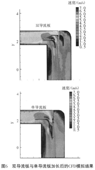 從圖5 可看出,采用雙導(dǎo)流板與單導(dǎo)流板,反應(yīng)塔進(jìn)口段的流速分布均存在不均勻的情況。針對(duì)上述情況,采取對(duì)導(dǎo)流板加長措施,再分別對(duì)雙導(dǎo)流板與單導(dǎo)流板進(jìn)行CFD 模擬,結(jié)果見圖6。